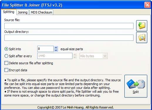 The application file is small enough to fit on a floppy disk. And the easy to use program and program interface can be used to split any file. Interestingly, it can also create its shell context menus in order to perform splitting and joining tasks directly from Windows Explorer. The application can be integrated easily. The users can split/ join multiple files using a .BAT file. Also, developers can write their own interface (in any language) to perform splitting/joining tasks from their applications.