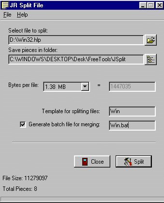 JR Split File is a free file splitter that splits large file into smaller files so that they can be easily copied to floppy disks or transferred via e-mail. The free ware is programmed with tolls and features that allows you to split a large file into smaller files and create a standard -.bat file that can be used to reconstruct a copy of the original file. This application is useful for breaking large text files into more usable segments or for breaking a file into segments to fit on multiple diskettes.
